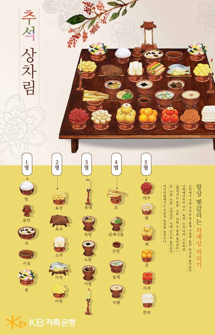 1열의 차례상은 좌반우갱 左飯右羹으로 좌측에는 메와 술 우측에는 갱을 올린다. 지난해 추석과 올해 추석 차례상 준비에 필요한 식재료를 비교해본 결과 과일 야채 생선가격이 최대 50까지 오른 것으로 나타났다.